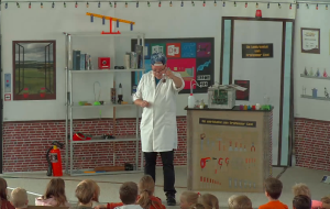 We zijn in het laboratorium van professor Cool. Professor Cool demonstreert zijn nieuwste uitvindingen aan de kinderen.